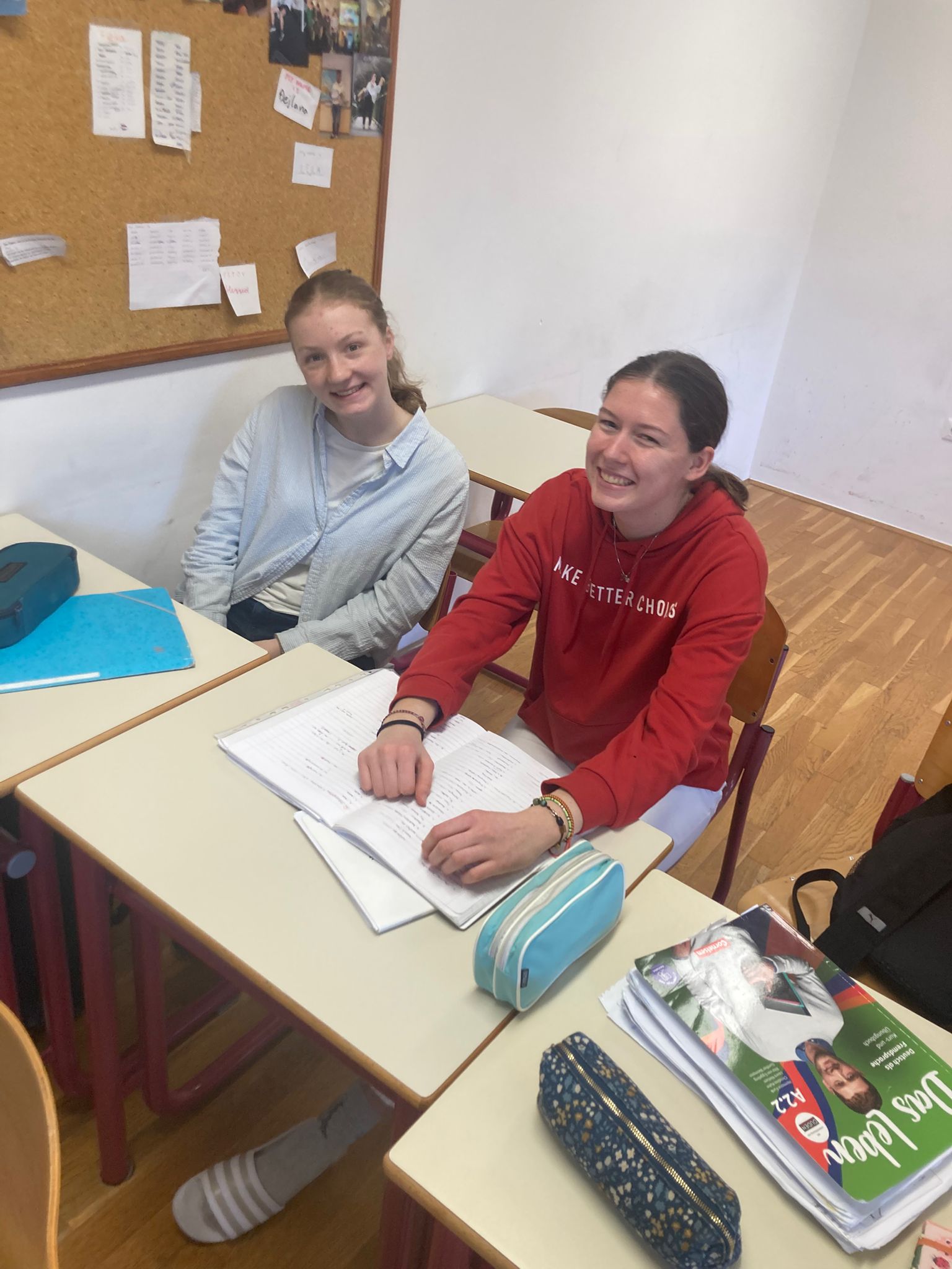 Spodaj sta še dve fotografiji Karen z njeno gostiteljico Nežko – pri pouku in pri odkrivanju Slovenije. Nežki in njeni družini smo zelo hvaležni za gostoljubje, prav tako tudi vsem, ki so pripomogli, da se je Karen pri nas počutila dobrodošlo.